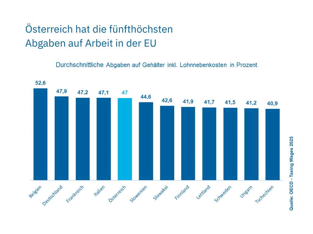 Die Abgaben machen in Österreich 47,2 % der Arbeitskosten aus – damit liegen wir im absoluten Spitzenfeld in der EU (Quelle: OECD).